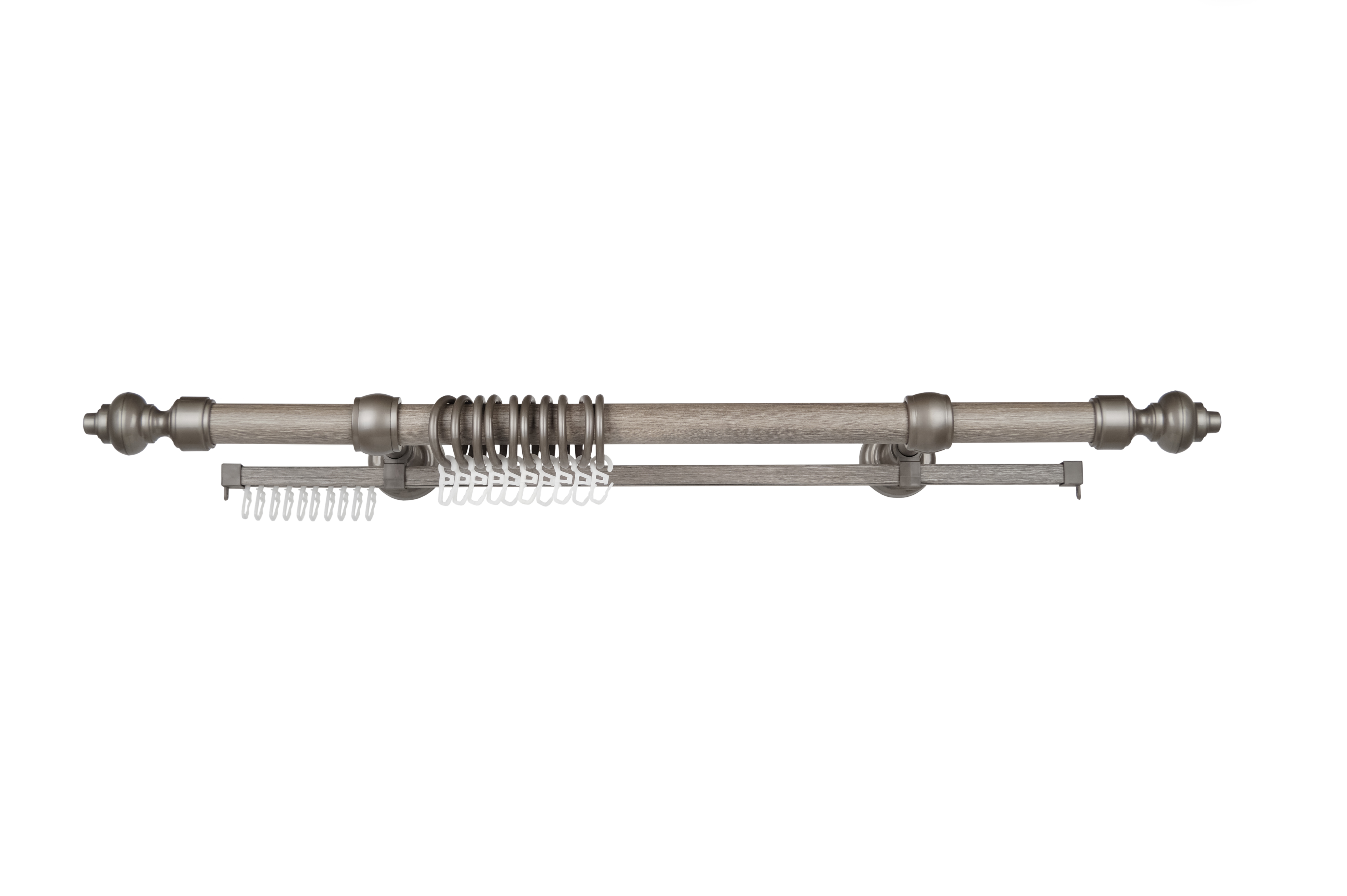 Металлические карнизы круглые сделаны из алюминия или стали с гальваническим покрытием или ламинируемые пластиком, имитирующим цвета дерева для того, чтобы карнизы подходили под паркет, ламинат, двери или мебель.