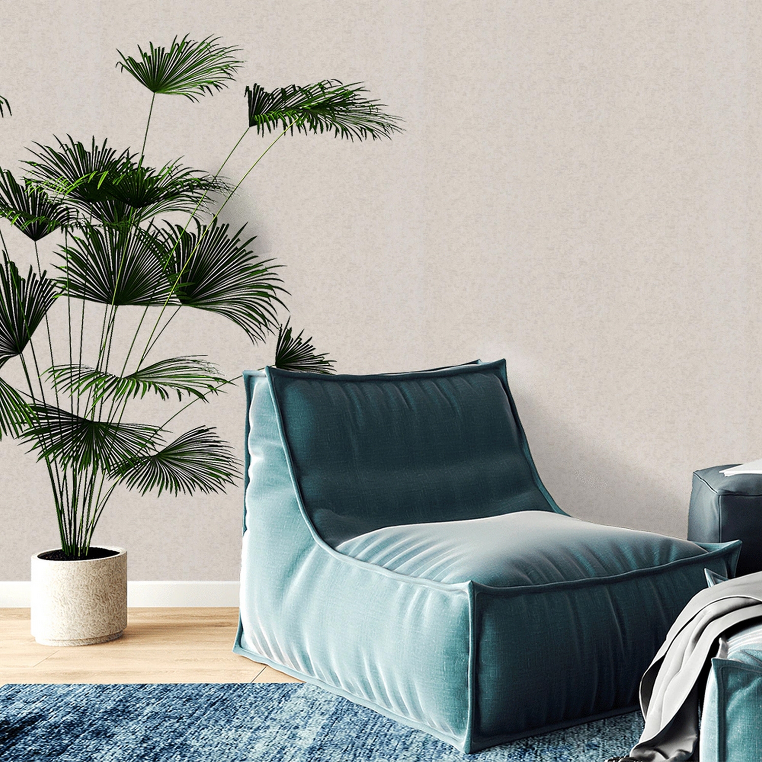 Продуманный текстурный рисунок напоминает каракулевый мех. Нежный перламутр прекрасно подчеркивает рельефность обоев и наполняет пространство мягким сиянием.
