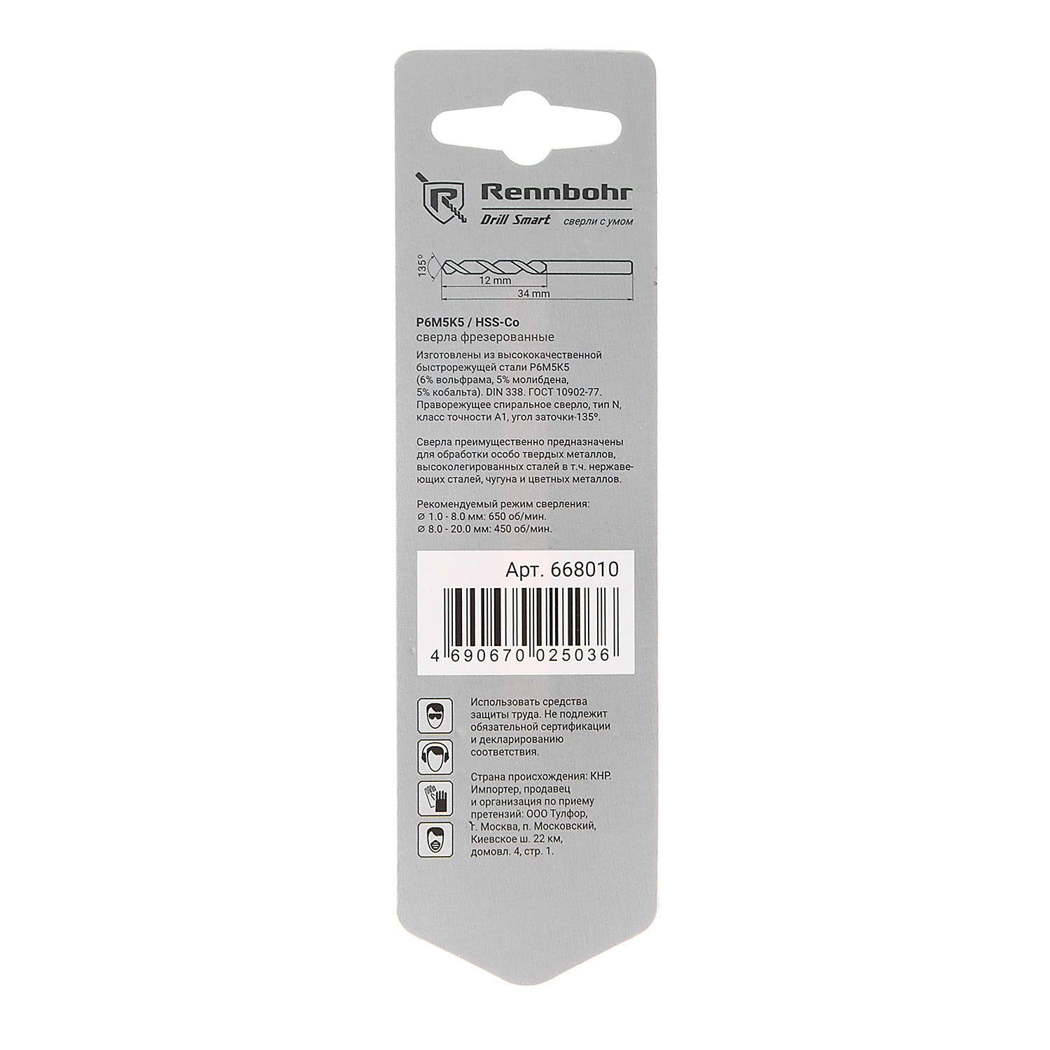 Сверло по металлу 1,00*34/12мм HSS-Co P6M5К5 (2шт) блистер арт.668010 COBALT RENNBOHR *10/40/640