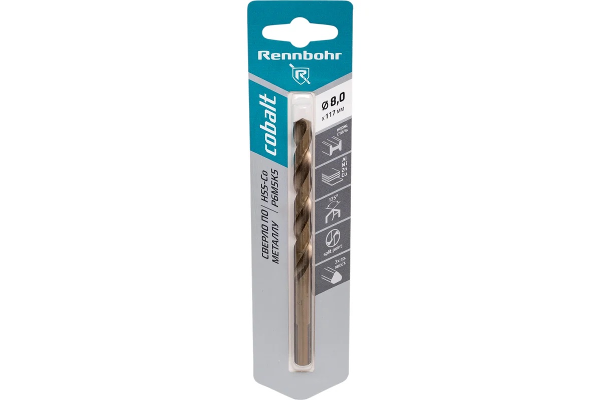 Сверло по металлу 8,00*117/75мм HSS-Co P6M5К5 (1шт) блистер арт.668080 COBALT RENNBOHR *10/40/320
