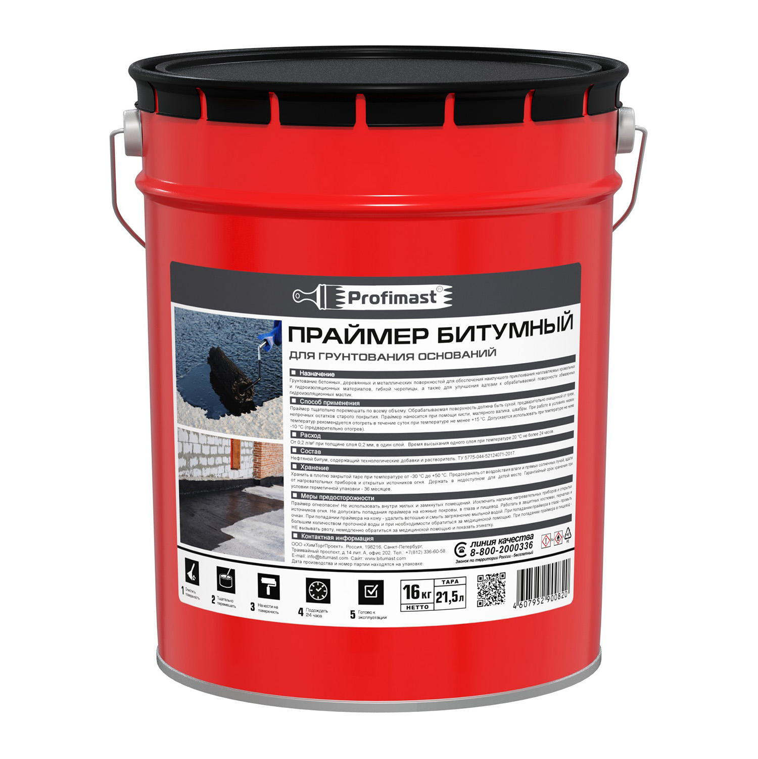 Праймер битумный Profimast совместим с большинством битумных и битумно-полимерных материалов, обладает малым временем высыхания, высокой проникающей способностью, эффективно пропитывает и связывает пыльные загрязнения. Не содержит толуола и других токсичных растворителей.