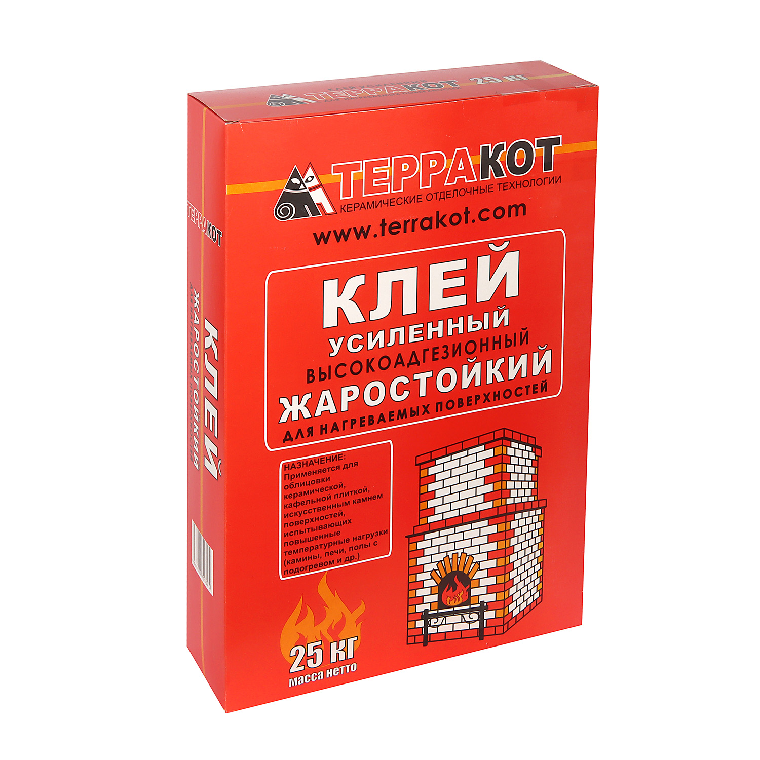 Жаростойкий клей Терракот — пластичная смесь с высокой степенью адгезии (силой сцепления). При соблюдении рекомендуемой толщины слоя не стекает с поверхностей. Стойкий к воздействию влаги и повышенных температур (до +400 °С).