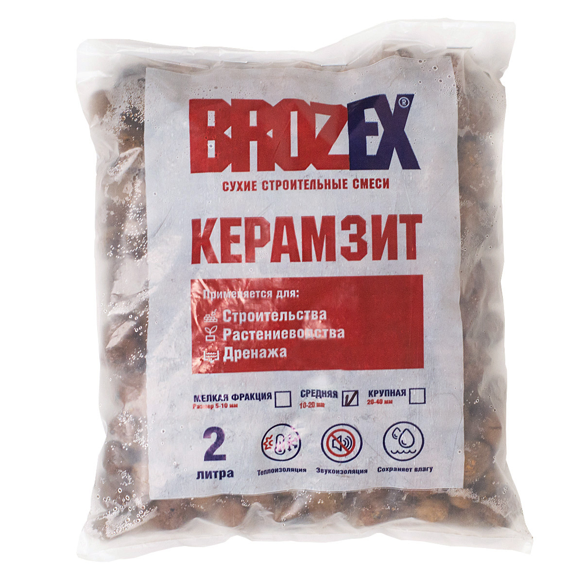 Керамзит BROZEX — искусственный, легкий, пористый строительный материал, получаемый путем обжига легкоплавкой глины до ее вспучивания. Имеет форму овальных и круглых гранул. Применяется в качестве тепло- и звукоизоляционной засыпки в конструкциях зданий (без бетонирования), для производства керамзитоблоков, в растениеводстве.